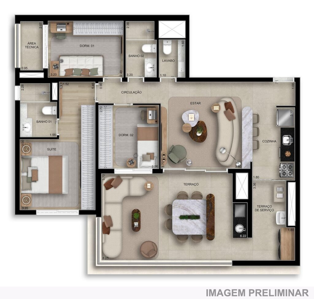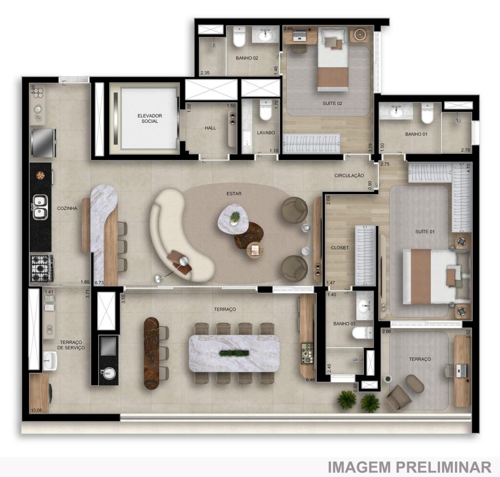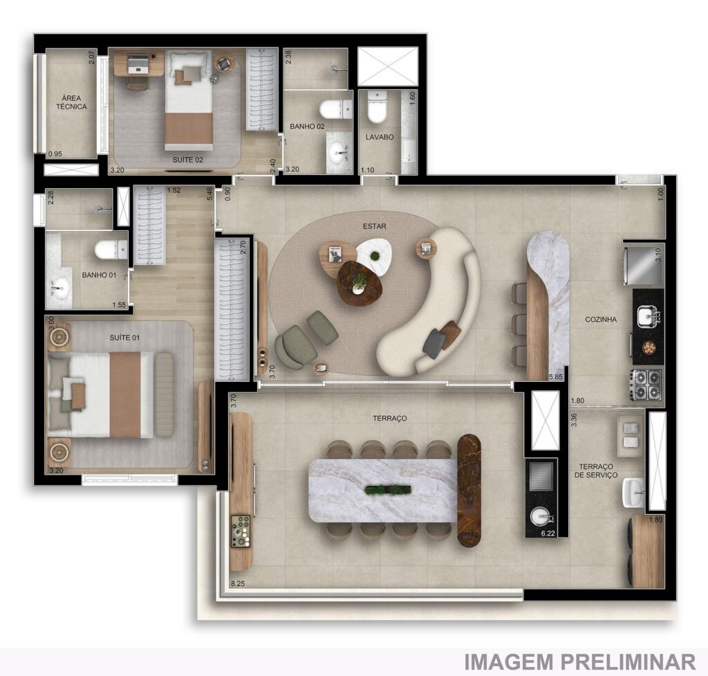 134m² - Planta 2 Suítes - Opção Living Ampliado